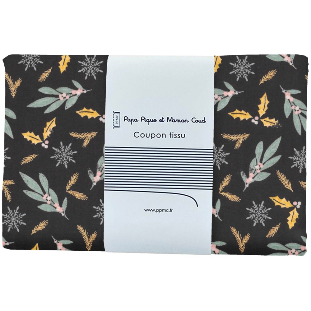 Nice cotton with good hold. Its vegetal pattern with touches of gold on a black background will be very chic for all your Christmas DIYs, decorations, furoshikis, etc...