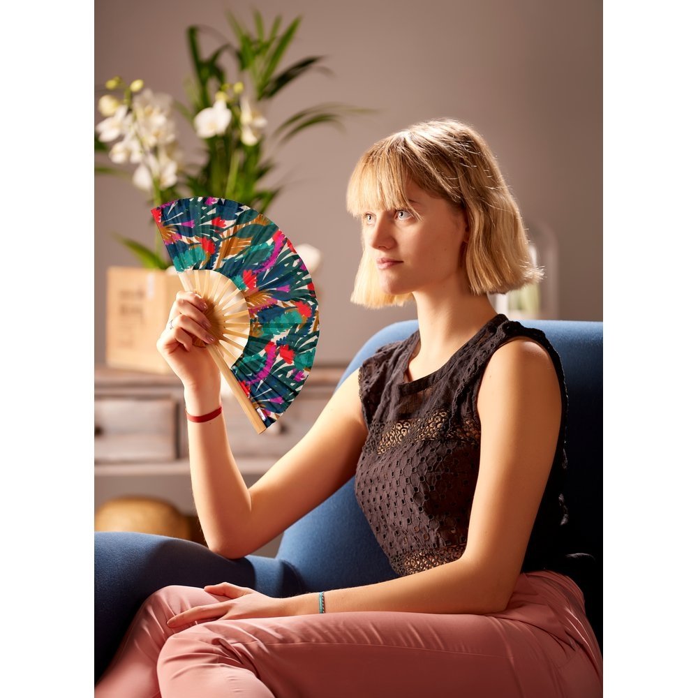 Our fan is a true fashion accessory that can match your bag, your scrunchie or your wallet. Made of varnished bamboo chopsticks and cotton fabric with fancy prints, it will make many people jealous on the beach when you start to air with it! Plus, with its compact size, you can take it anywhere and slip it into any bag or clutch!