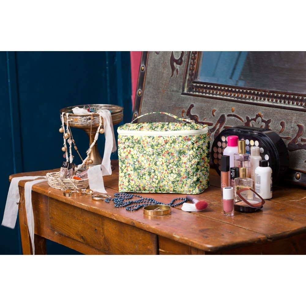 This coated cotton vanity case is spacious enough for a weekend or longer vacation.
