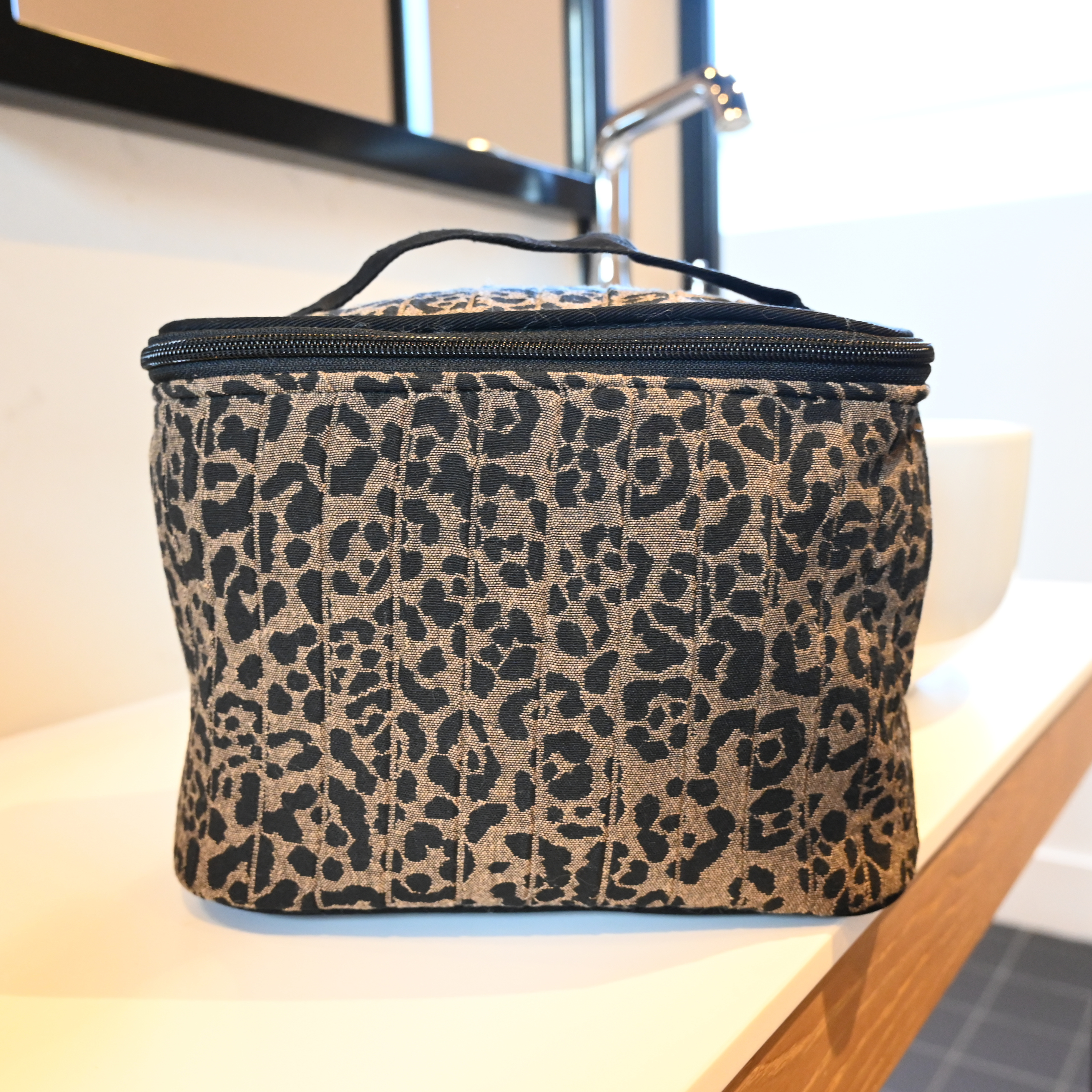 This coated cotton vanity case is spacious enough for a weekend or longer vacation.
