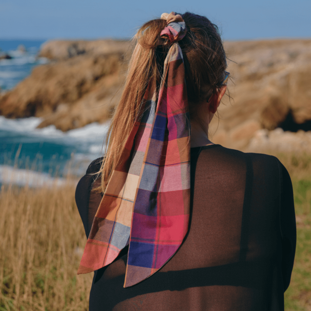 Indeed, it is ideal for long hair but also adapts to medium-length hair and even short hair! In fact, you can simply use the foulchie ribbon to wear around your head for a bohemian style. With a little reminder of the pattern by wearing the scrunchie on your wrist for a trendy touch.